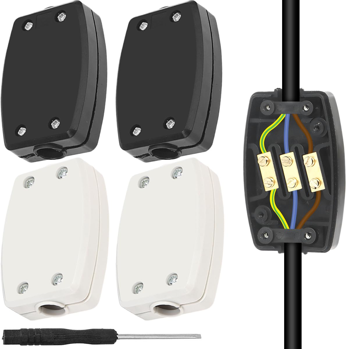 Se usan así: introduces los cables pelados por los agujeros laterales, aprietas los tornillos con un destornillador (viene uno incluido en el pack) y ya está. La caja se cierra con una tapa a presión, dejando el empalme protegido, aislado y sin riesgo de cortocircuitos o descargas.
